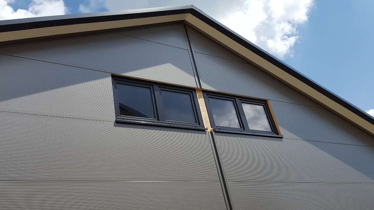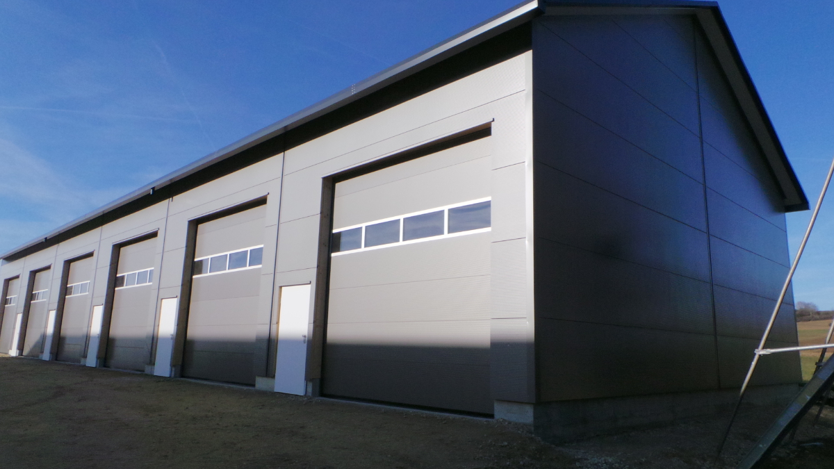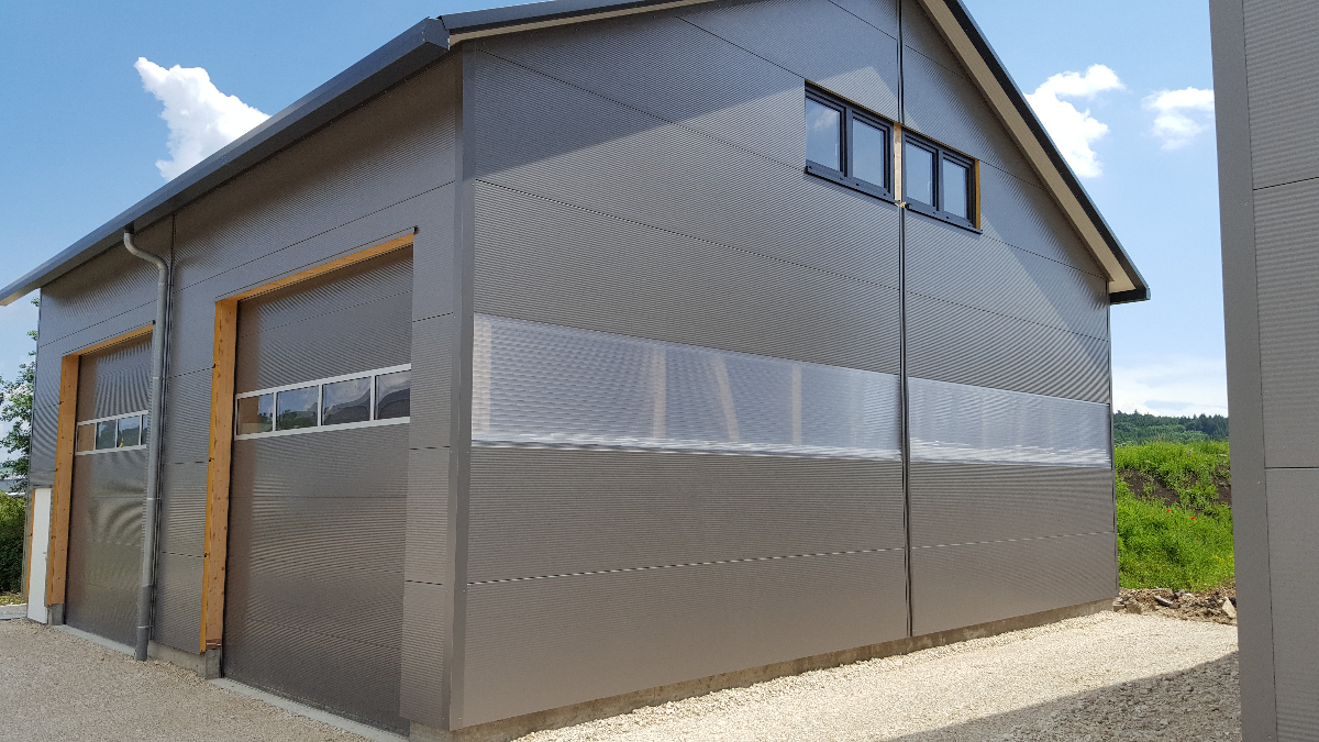 Die Außenfassade wird je nach Standort und Gegebenheiten gefertigt. Das Satteldach ist mit Sandwichplatten oder alternativ mit Stahltrapezblech eingedeckt. Inkl. Dachrinnen und Ablaufrohren.